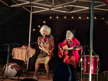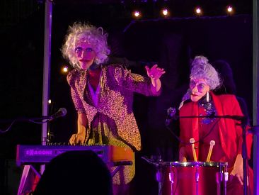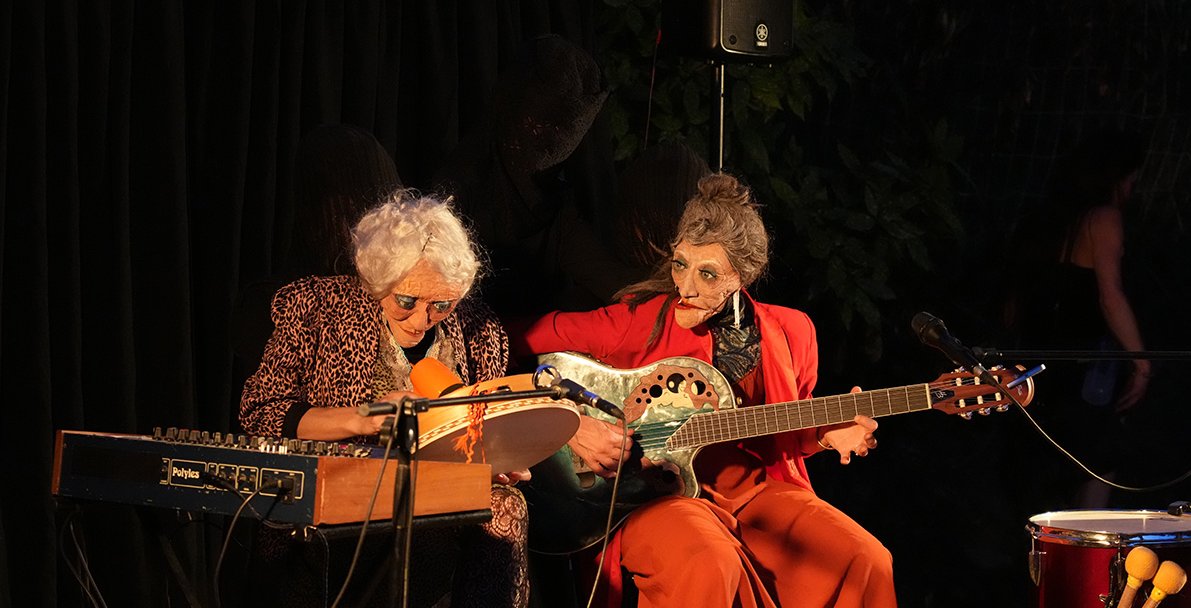 Deux marionnettes à taille humaine, deux vieilles chanteuses siciliennes que la musique habite avec l’intensité des femmes qui ont vécu, mais sans jamais s’avouer vaincues. Frêles et délicates comme deux vieilles branches, filet de guitare et torrent de voix, elles vous mordent au cœur, puis d’un coup de synthé technoïde nous plongent dans un rire affolé, avec toute l’insolence que peuvent se permettre ces divas qui n’ont plus rien à prouver que leur amitié et la joie d’être encore de ce monde, ensemble.