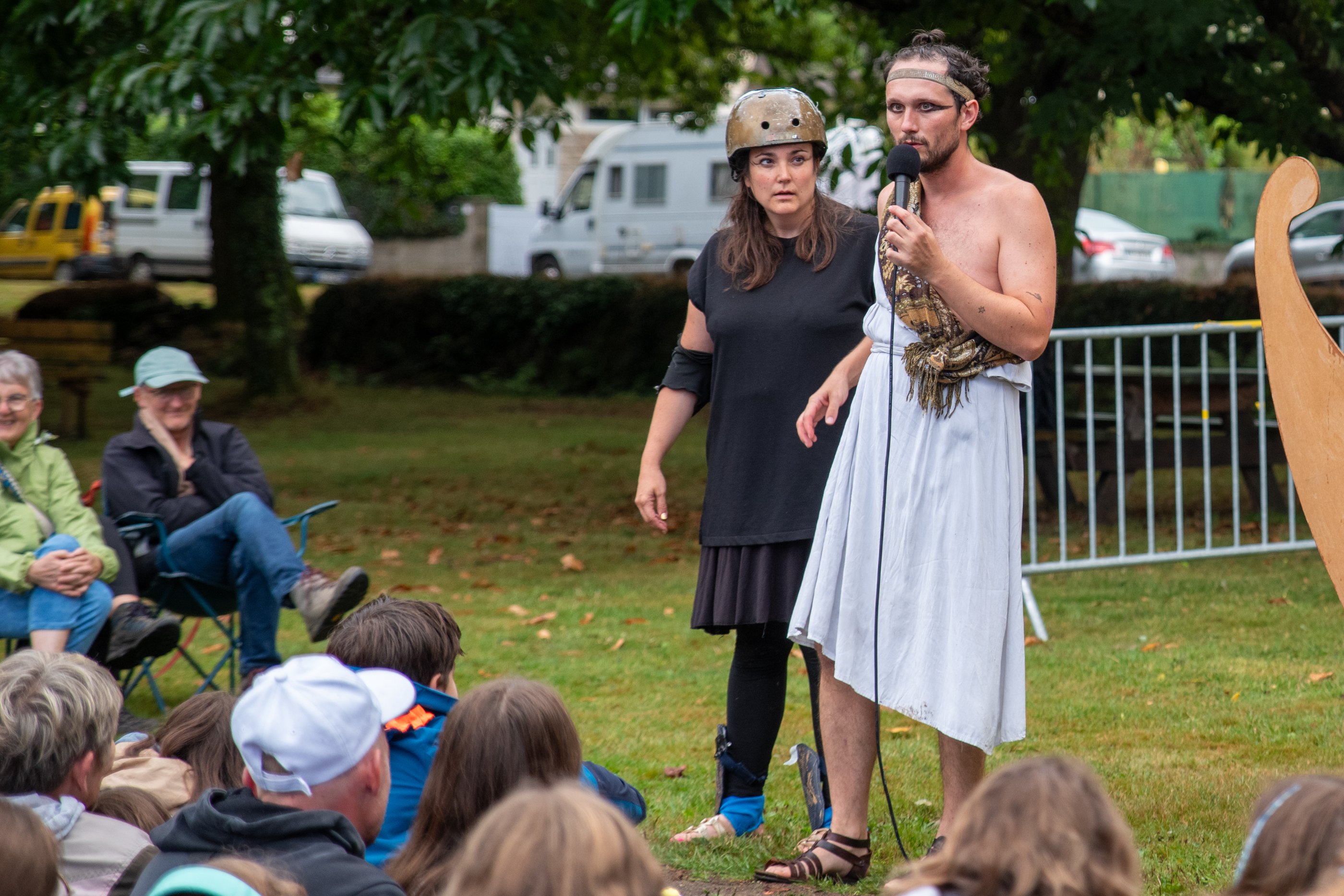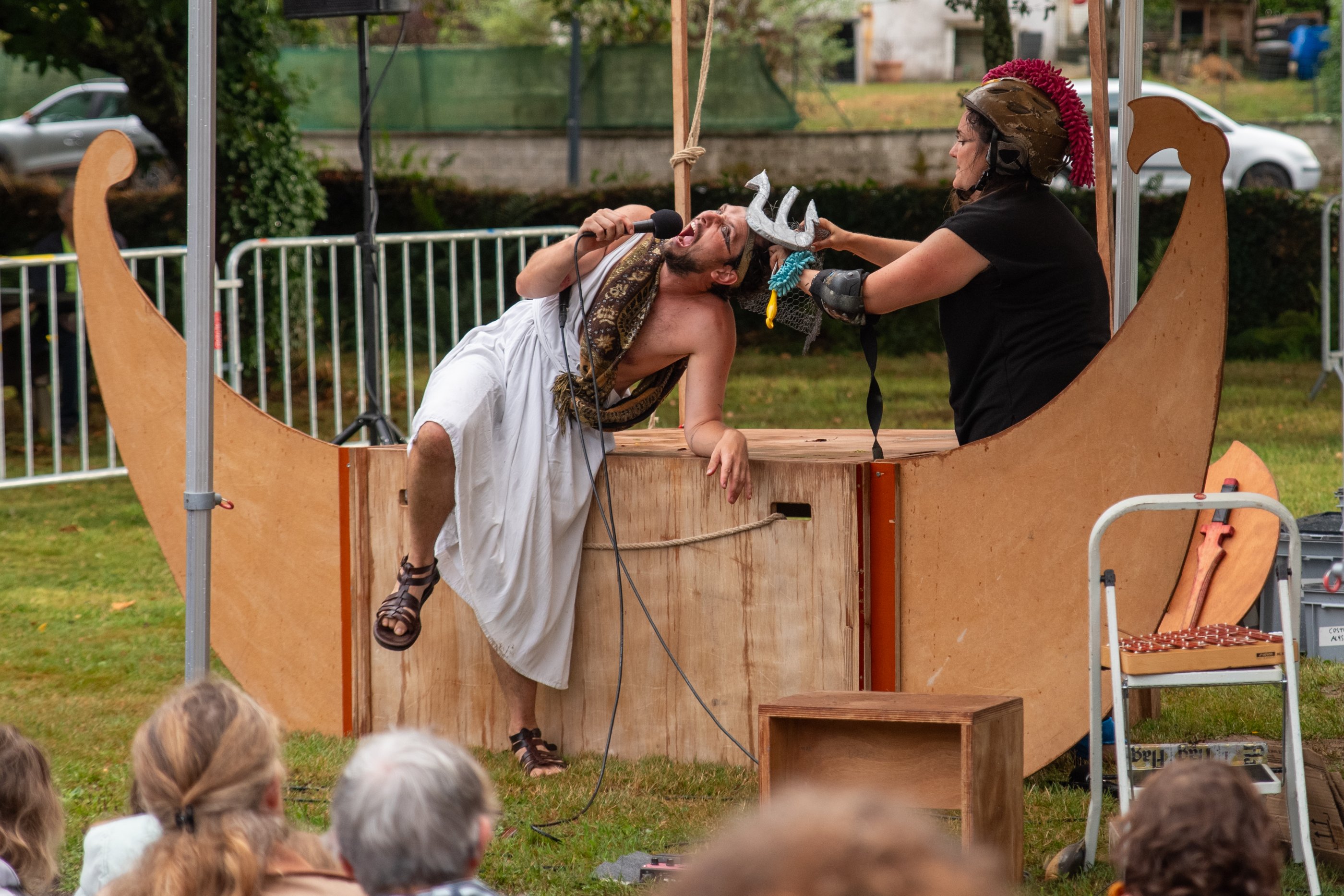 Morgane joue le rôle d’Alysse (à ne pas confondre avec Ulysse) et celui de tous les autres personnages. Damien, lui, est le narrateur. Il chante, rappe et adore se faire porter comme une rockstar par le public. Ensemble, ils nous retracent tout l’œuvre d’Homère avec des perruques, des bouts de bois, du carton, de la corde et surtout, beaucoup de joie.