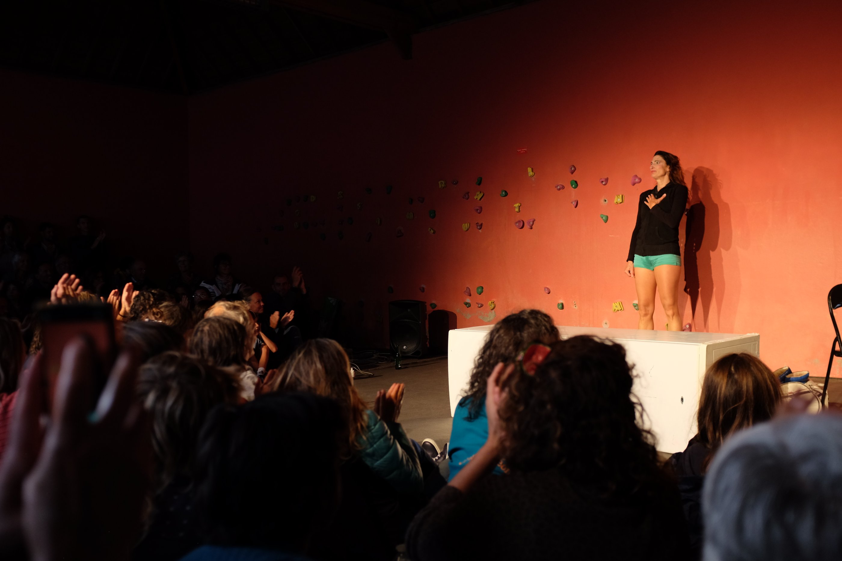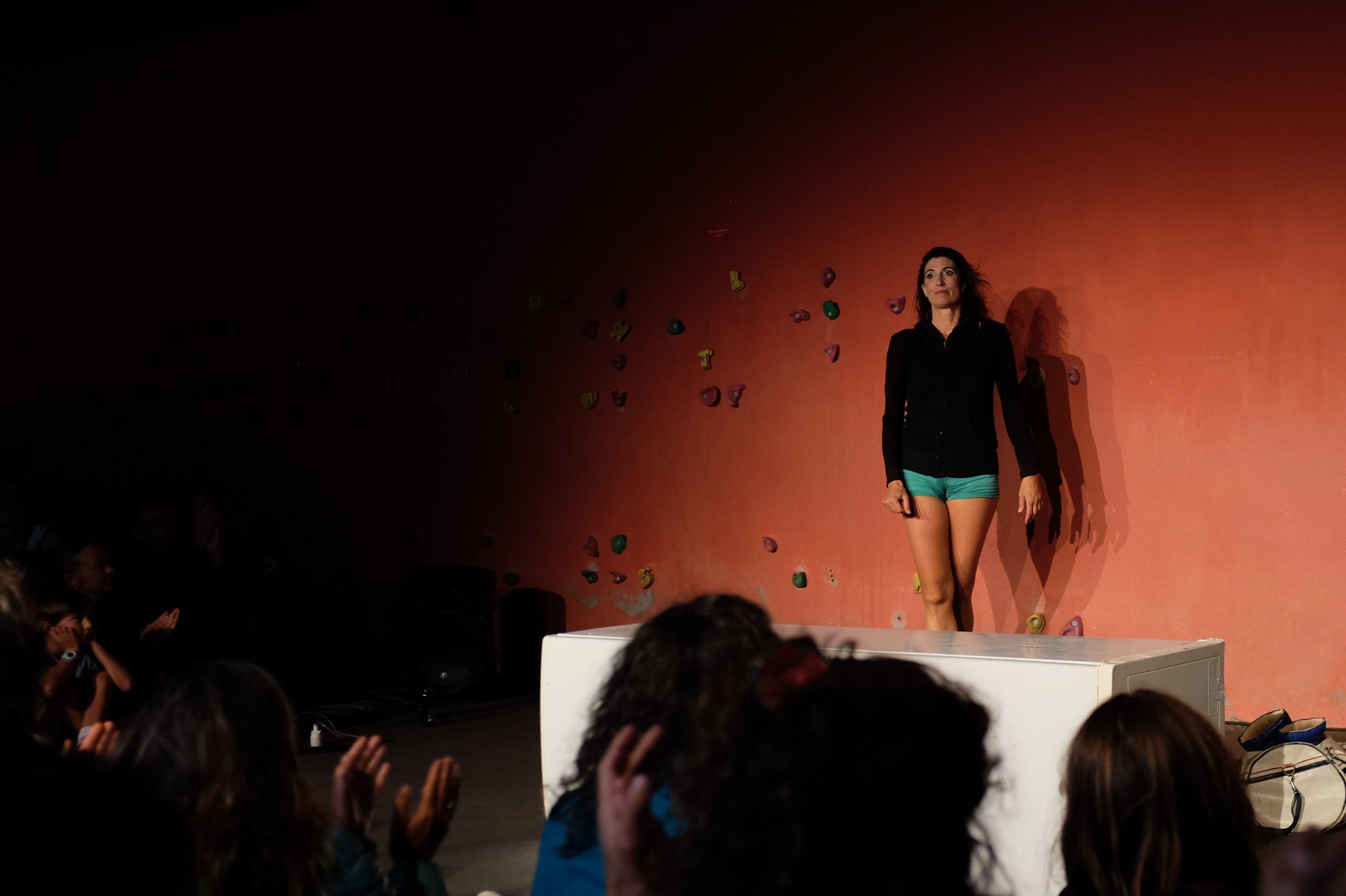 Christine est une boxeuse, un personnage assez masculin en mini-short. C’est une nana avec des jambes de deux mètres de long qui ressemble à Julia Roberts mais avec un nez de clown et des dents pourries. Si elle est avec nous ce soir, elle est aussi dans son monde avec l’énergie de Marry Popins. Christine fume, elle « provoque » le cancer, elle aime bien le rhum et elle met du rouge à lèvres. Christine est belle. More Aura est un spectacle sur la résilience, le combat pour la vie, la douce folie qui nous permet parfois de rester debout. Un spectacle drôle et émouvant.