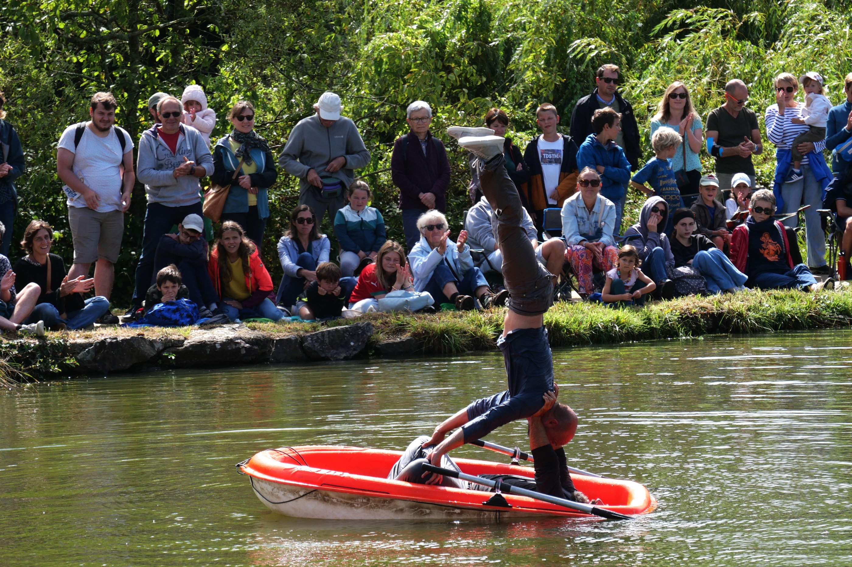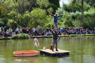 Au milieu de l’étang du Trévoux tangue une barque. Le spectacle aura lieu ici, sur ce radeau, stable, petit, suffisant s’il flotte jusqu’au bout sans chavirer. Mais avant de commencer, il reste encore quelques incontournables préparatifs, importants et dérisoires. L’important, c’est de garder le cap même quand tout vacille sous le poids de l’incertitude. Après la rue et le chapiteau, le duo Mickael Le Guen et Benjamin De Matteis prend le grand large ! Un spectacle fort, clownesque et acrobatique au rythme de l’eau.