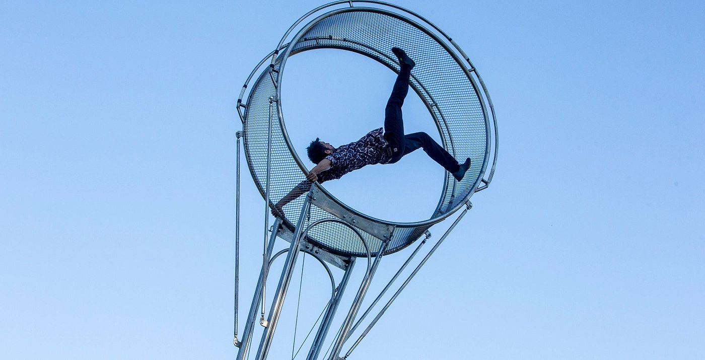 La roue de la mort est un objet mythique et rare du cirque traditionnel, dont l’envergure et le mouvement circulaire sont chargés de nombreux symboles. Dans 78 tours, La Meute explore cette dimension totémique et rituelle : l’infiniment grand et l’infiniment petit, notre rapport à la vie et à la mort, la tendresse et la violence, la bêtise et la beauté. Embarquons dans un voyage acrobatique, musical, hypnotique et résolument poétique porté par ce joyeux trio d’artistes.