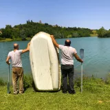 Après la rue et le chapiteau, le duo Mickael Le Guen et Benjamin De Matteis prennent le grand large ! Un spectacle fort, clownesque et acrobatique au rythme de l’eau.