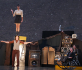 Entre danse décalée, bruitage farfelu, acrobaties approximatives et tours de magie saugrenus, Mort ou Vif transporte les spectateurs dans une ambiance électrique menée par une batterie puissante et des guitares qui chuintent dans les vestiges d’un soundsystem poussiéreux.